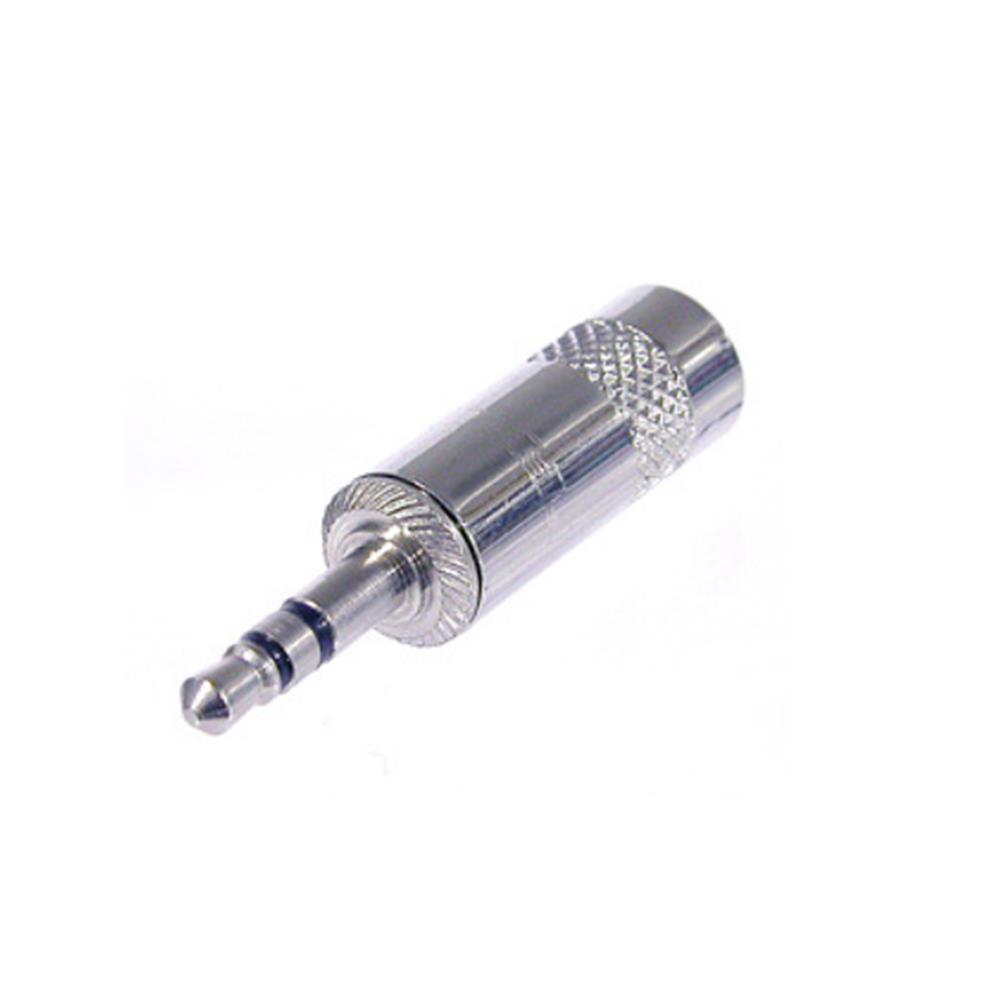 Stereo 3 pole 3.5 mm plug, crimp strain relief, black plated metal handle, gold plated contacts, large cable outlet